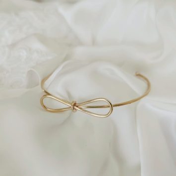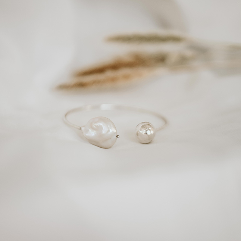 Sophistication at its best, the Mademoiselle bangle consists of one beautiful baroque pearl and a metal pearl clustered on an open wire bangle.